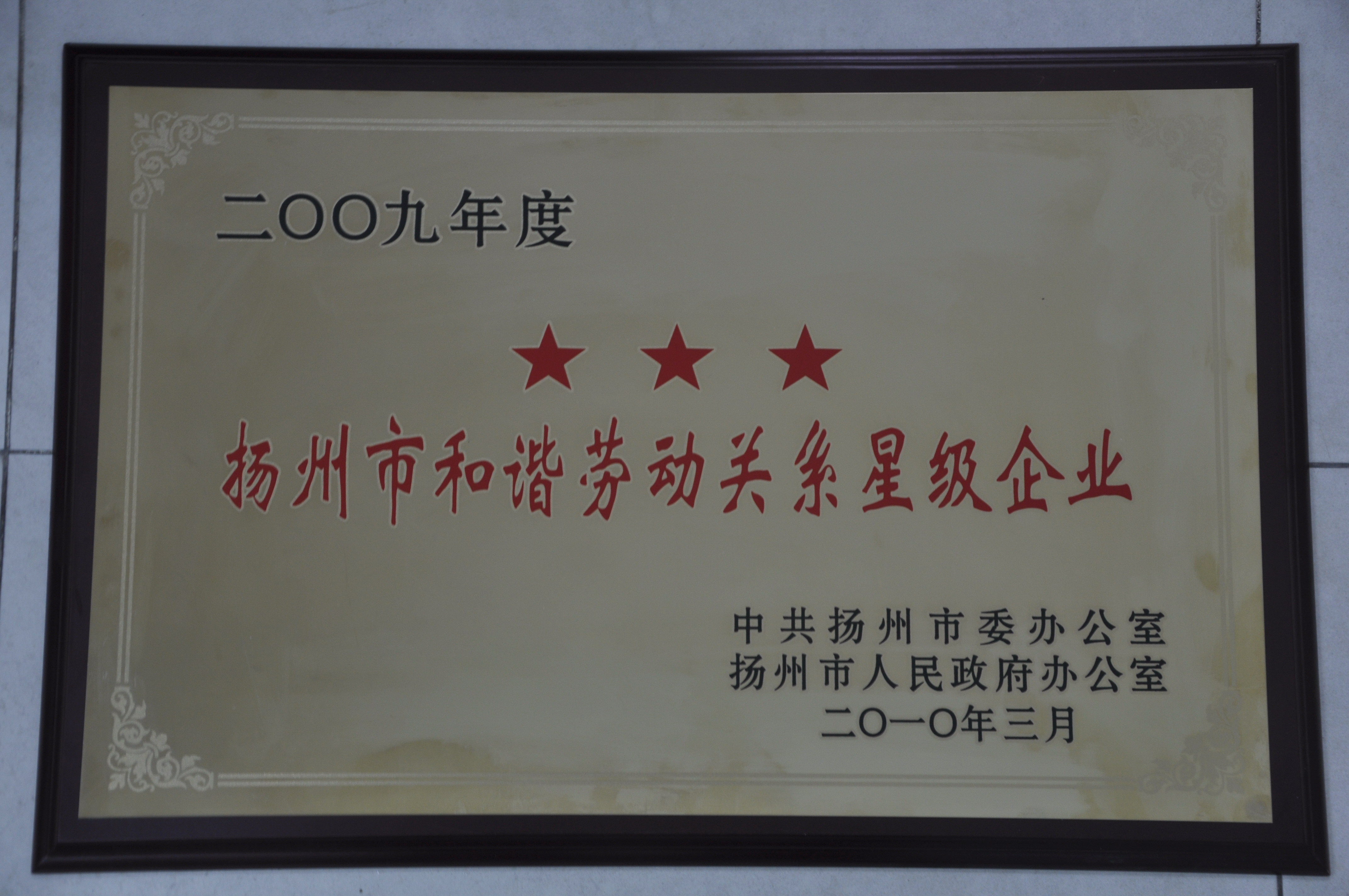 > 集團(tuán)公司獲2009年揚(yáng)州市和諧勞動(dòng)關(guān)系“三星級企業(yè)”殊榮