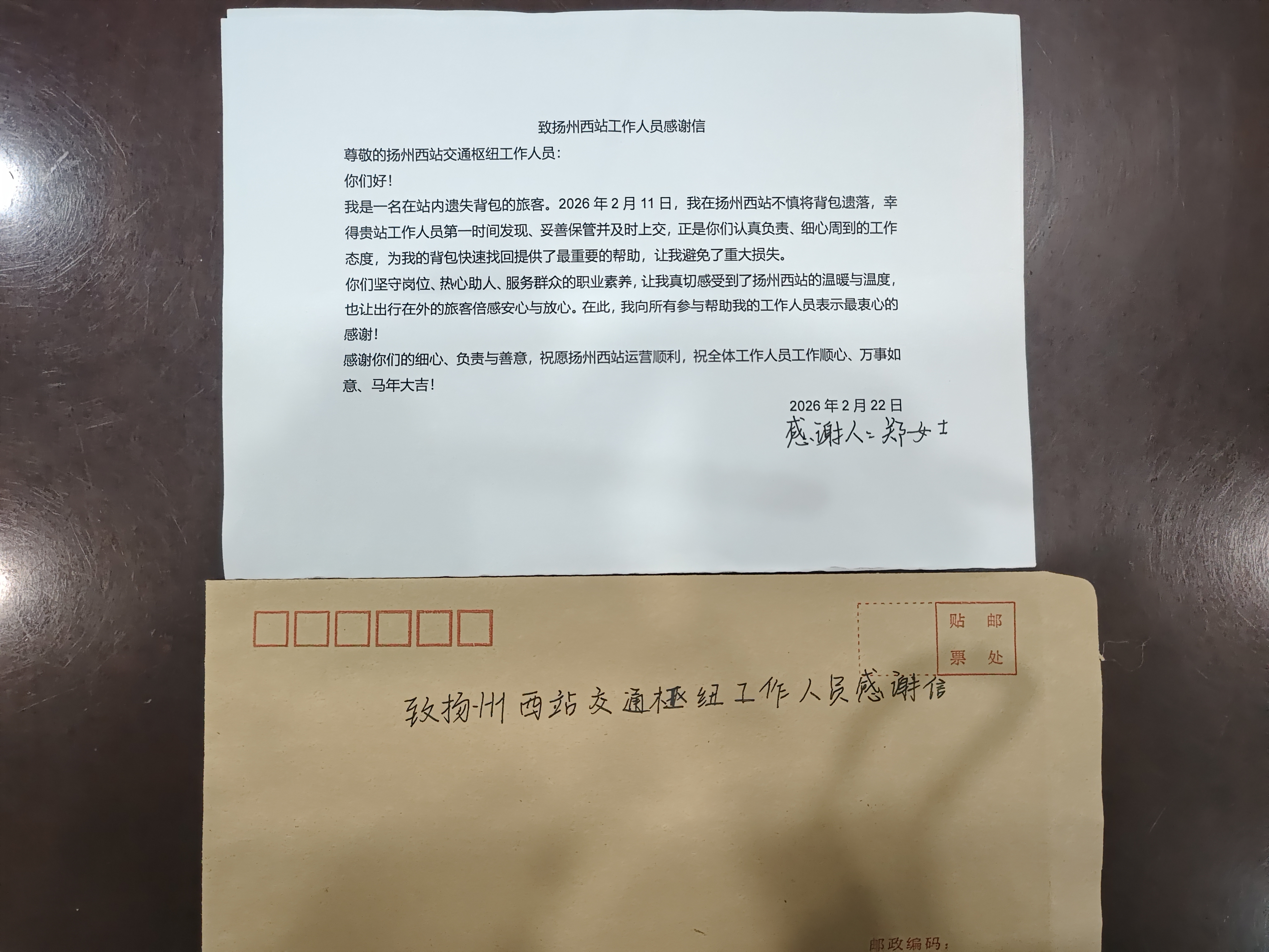 而這份“遲來”的感謝信,正是失主對揚州站工作人員認(rèn)真負(fù)責(zé)態(tài)度的由衷肯定。信中寫道:“從發(fā)現(xiàn)失物到妥善保管、再到主動對接,每一個環(huán)節(jié)都體現(xiàn)出你們嚴(yán)謹(jǐn)細(xì)致、熱心助人的職業(yè)素養(yǎng)。正是因為有你們這樣堅守崗位、默默付出的工作人員,才讓揚州這座‘好地方’更溫暖、更安心。”